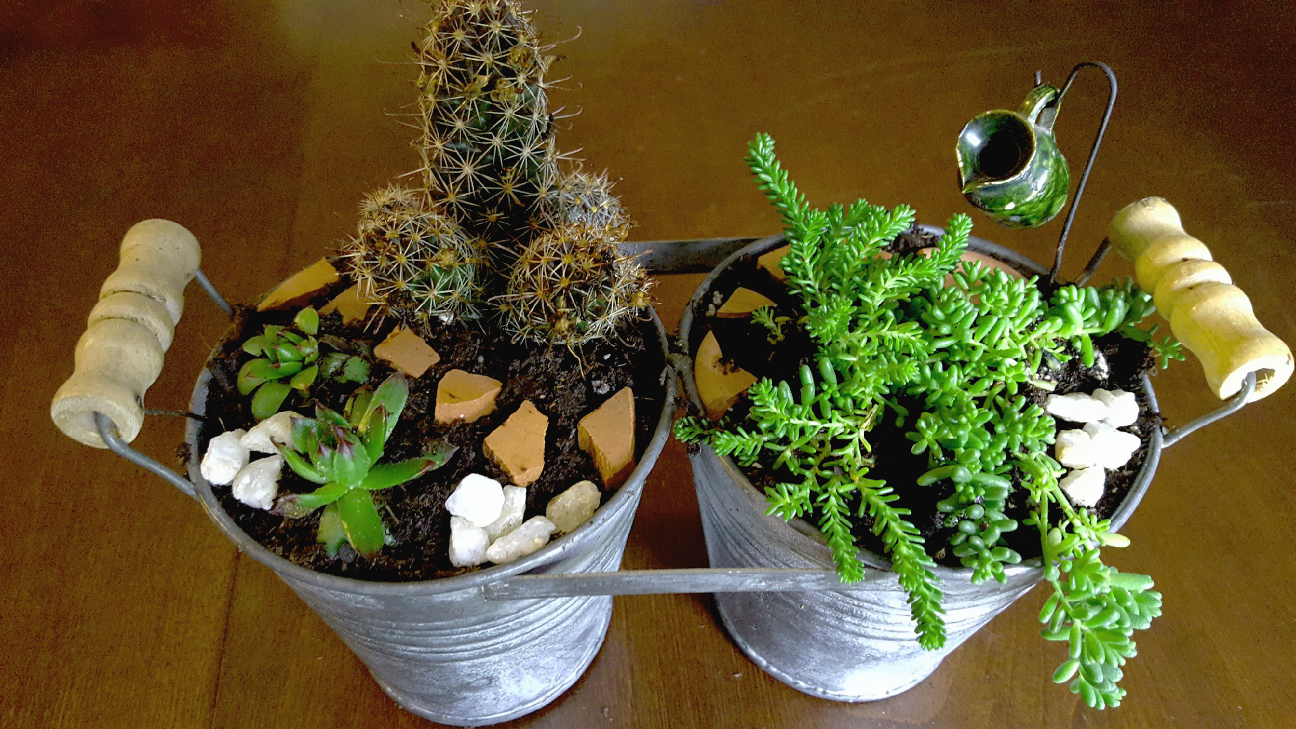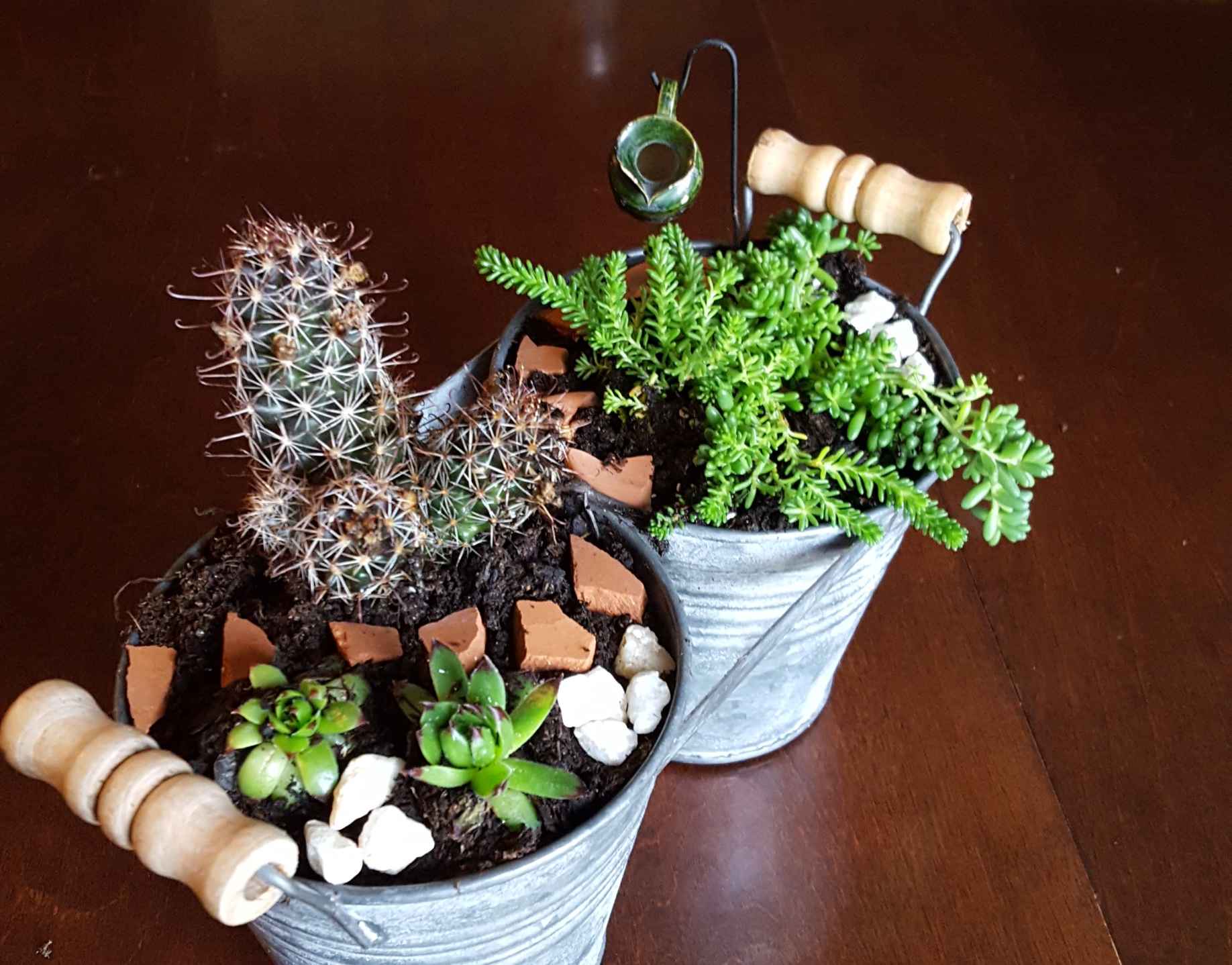 Fairy Garden with Succulents in Rustic Tin Planters