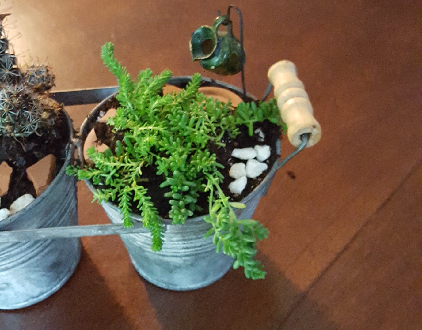 Fairy Garden in Connected Rustic Bucket Planters with Succulents. Love the shepherd hook where fairies 🧚🏼♂️ leave the container to water the succulents.Measures: 9” width handle to handle. 5” pots height, 10” apprx(plants and pot heigt). Each pot:4” diameterPrice:$16 dollars.