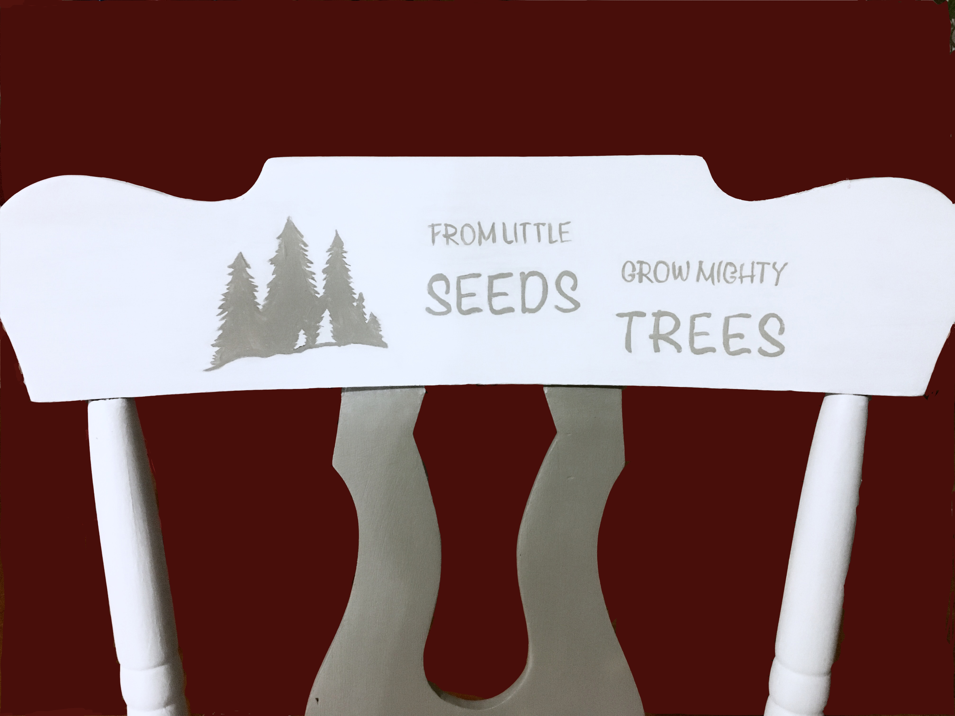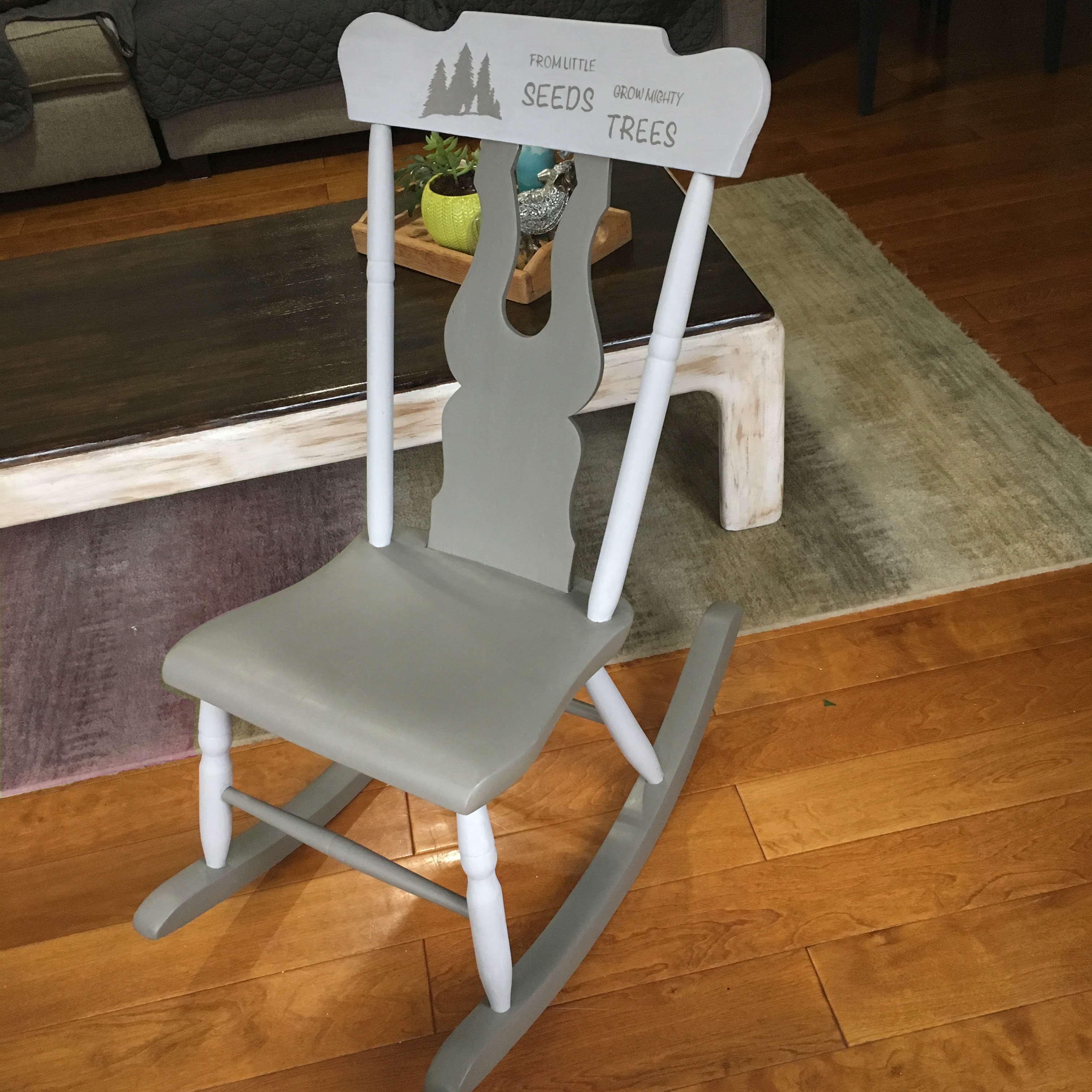 A petite vintage wooden primitive rocking chair with a nice dramatic shape. This sturdy piece is in great condition, painted by hand in two gray tones in chalk paint with an inspirational quote “From Little Seeds Grow Mighty Trees” becoming unique. Perfect to transmit a positive message while being use as decoration, or being used.Working in a sign with same phrase and design!